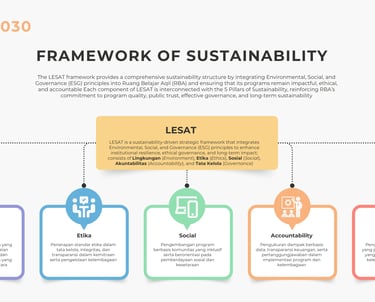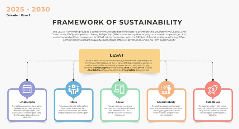 Mulai tahun 2025, pendekatan keberlanjutan diintegrasikan dalam kerangka LESAT, yaitu singkatan dari Lingkungan (Environment); Etika (Ethics); Sosial (Social); Akuntabilitas (Accountability), dan Tata Kelola (Governance). LESAT memfasilitasi transformasi prinsip I-CoPE ke dalam kebijakan kelembagaan dan strategi pengembangan jangka panjang berbasis ESG (Environmental, Social, Governance). Setiap elemen LESAT saling berkaitan dengan pilar keberlanjutan sebelumnya, dan sekaligus menjadi fondasi untuk operasionalisasi Theory of Change (ToC) yang mulai digunakan RBA sejak 2024.