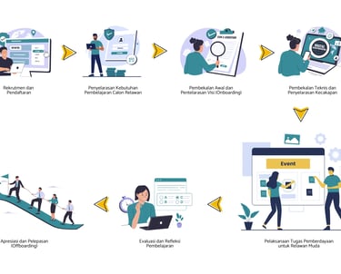 Menjadi Relawan Muda bukan sekadar mendaftar lalu menjalankan tugas—tetapi memasuki sebuah proses pembelajaran, kolaborasi, dan refleksi yang dirancang agar setiap relawan dapat berkembang sebagai individu yang unggul, peduli, dan berdaya. Berikut adalah siklus relawan yang kami jalankan: